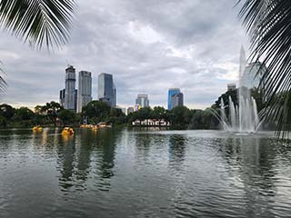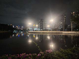 ![]() | 雨も止んできたのでベンジャキティ公園へ入ります。 ライトアップが始まっています。 夕景の高層ビル群がイイ感じ! 次の目的地は、Bエリアの休憩所です。 | |