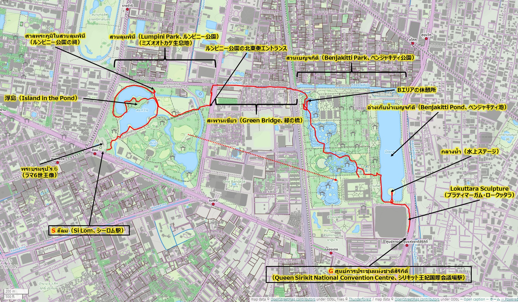| ポイント | #お楽しみポイント ・ミズオオトカゲに会う・สวนลุมพินี(Lumphini Park、ルンピニー公園)の散策 ・สวนเบญจกิติ(Benchakitti Park、ベンジャキティ公園)の散策 ・สวนเบญจกิติ(Benchakitti Park、ベンジャキティ公園)の夜景・ライトアップ ・พระบรมรูป ร.6(ラマ6世王像) ・สะพานเขียว(緑の橋、Green Bridge、高架遊歩道)、スカイウォーク(高架遊歩道) ・กลางน้ำ(Water Stage、水上ステージ)、อ่างเก็บน้ำเบญจกิติ(Benjakitti Pond、ベンジャキティ池) ・ประติมากรรมโลกุตระ(Lokuttara Sculpture、プラティマーガム・ロークッタラ) #基点(駅) ・S(スタート): สีลม(Si Lom、シーロム駅)・MRTブルーライン・G(ゴール): ศูนย์การประชุมแห่งชาติสิริกิติ์(Queen Sirikit National Convention Centre、シリキット王妃国際会議場駅)・MRTブルーライン | |