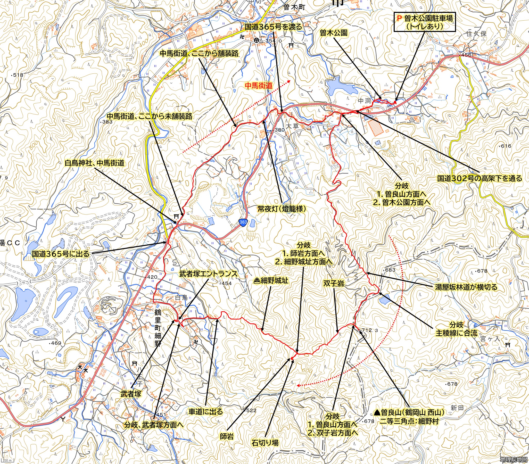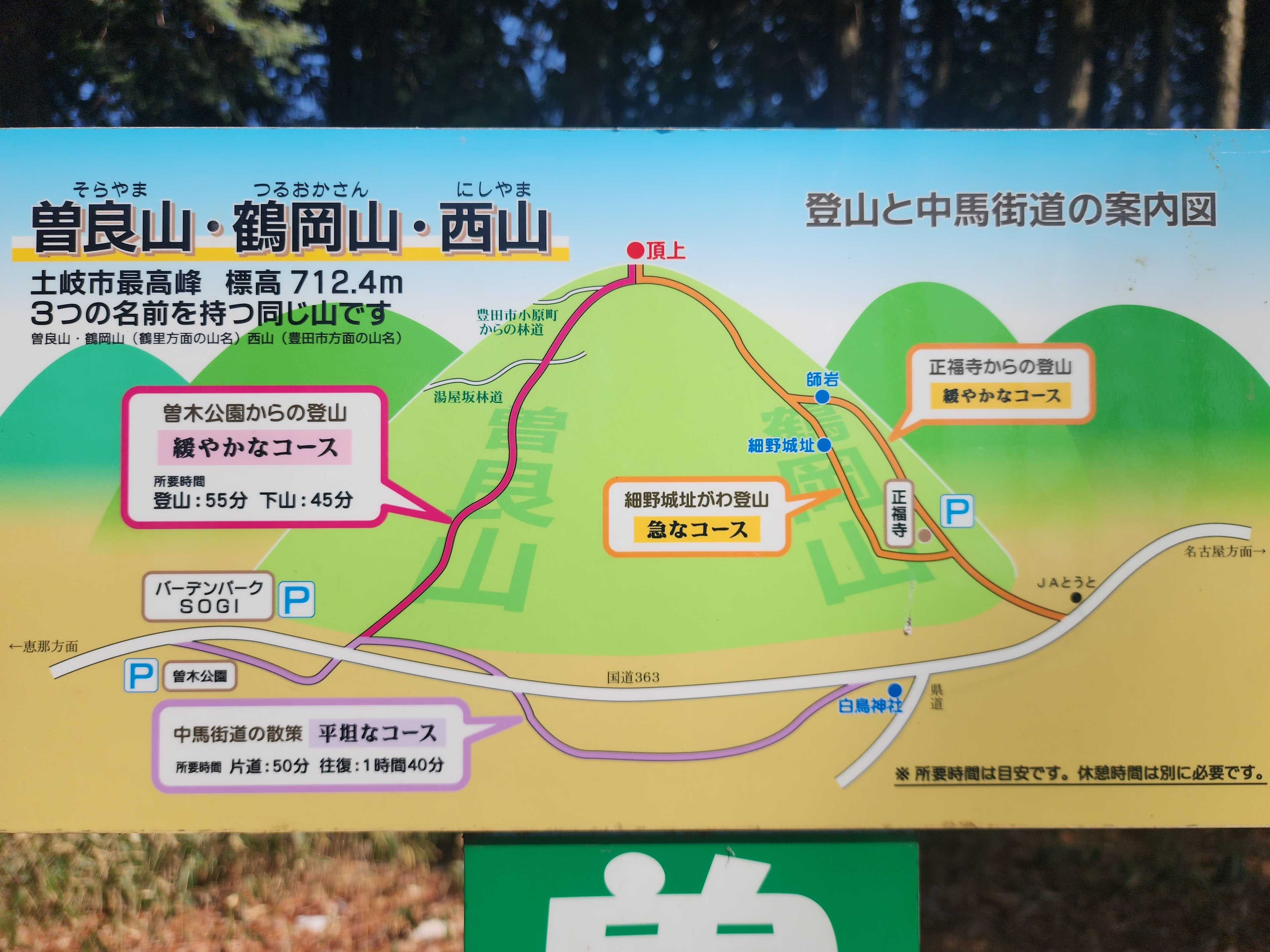| ポイント | #お楽しみポイント ・曽良山(そらやま、鶴岡山 西山、標高712m)の登頂・二等三角点:細野村の確認 ・師岩(もろいわ、弘法大師足跡岩)、双子岩 ・細野城跡(ほそのじょう) ・武者塚 ・曽木公園(そぎこうえん)の散策 ・中馬街道(ちゅうまかいどう)の散策 #基点(駐車地) ・曽木公園駐車場 | |