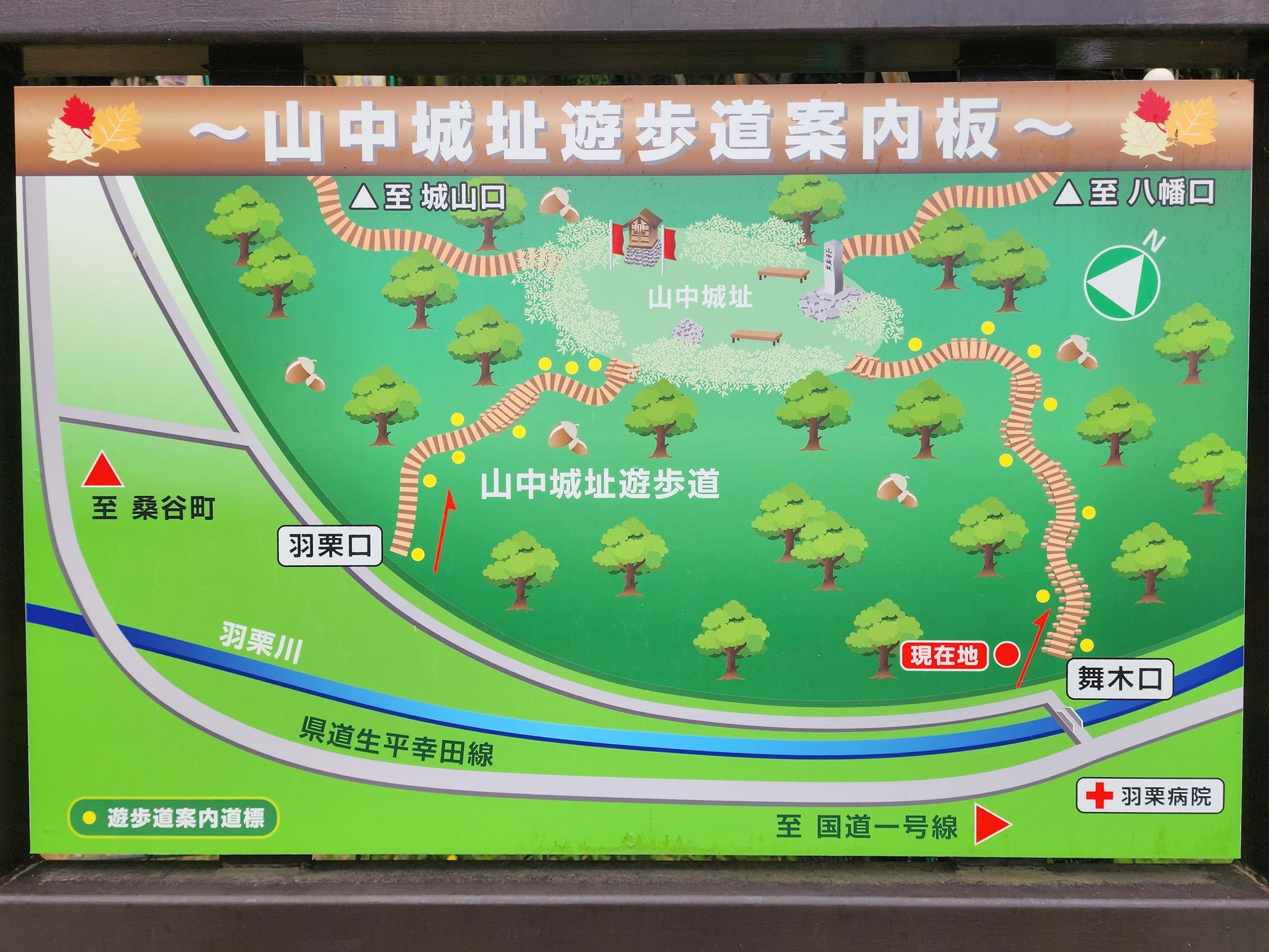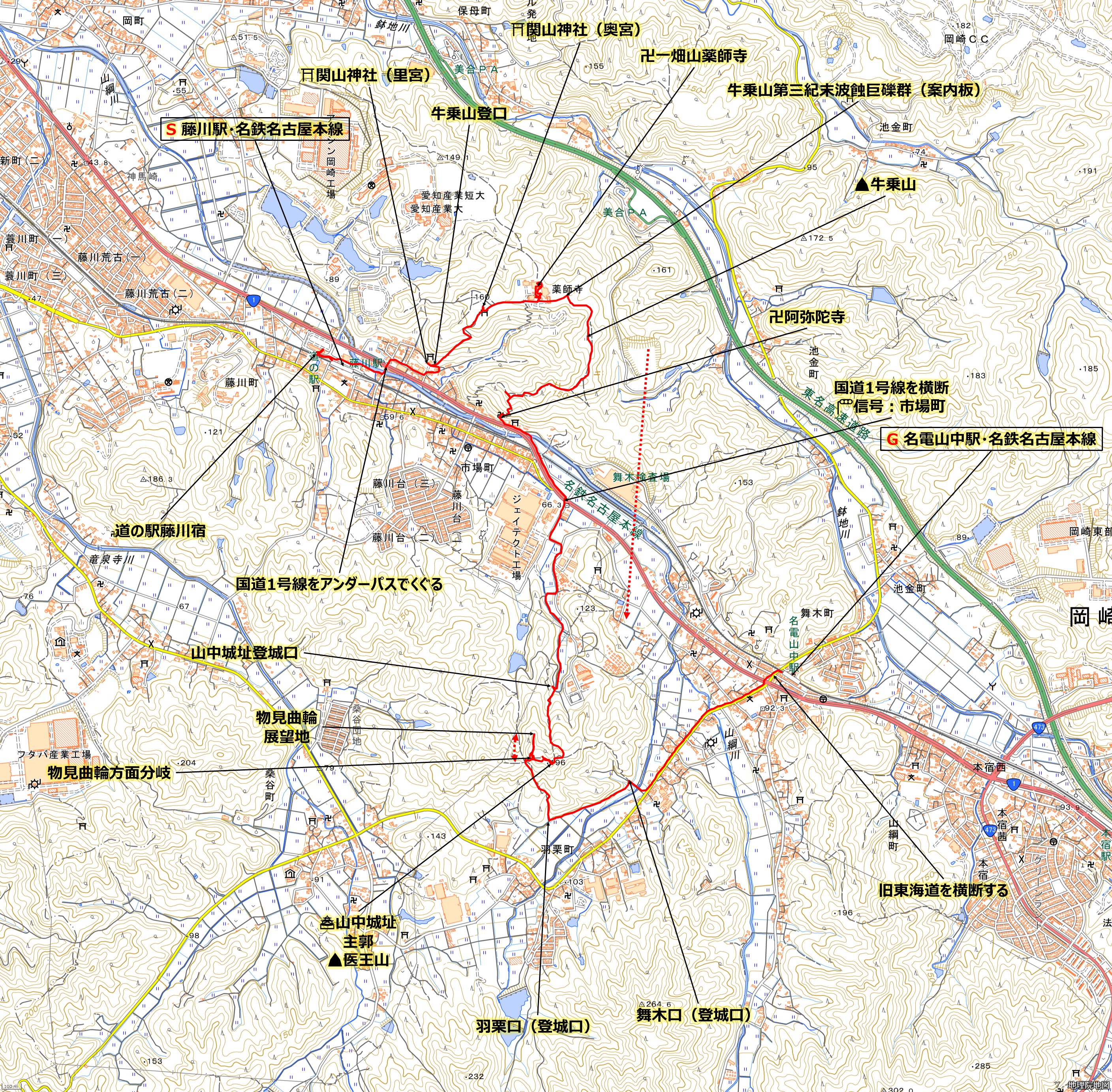 | ポイント | #お楽しみポイント ・牛乗山(うしのりやま、標高172m)、山中城址(やまなかじょうあと、医王山、標高196m)の登頂・山中城址 ・牛乗山第三紀末波蝕巨礫群(だいさんきまつ・はしょくきょれきぐん)(岡崎市指定天然記念物) ・一畑山薬師寺 #基点(駅) ・スタート(S): 藤川駅・名鉄名古屋本線・ゴール(G): 名電山中駅・名鉄名古屋本線 | |