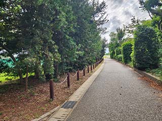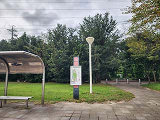 ![]() | 公園西側の小さいエントランスを出て南西方面へ歩きます。 | |