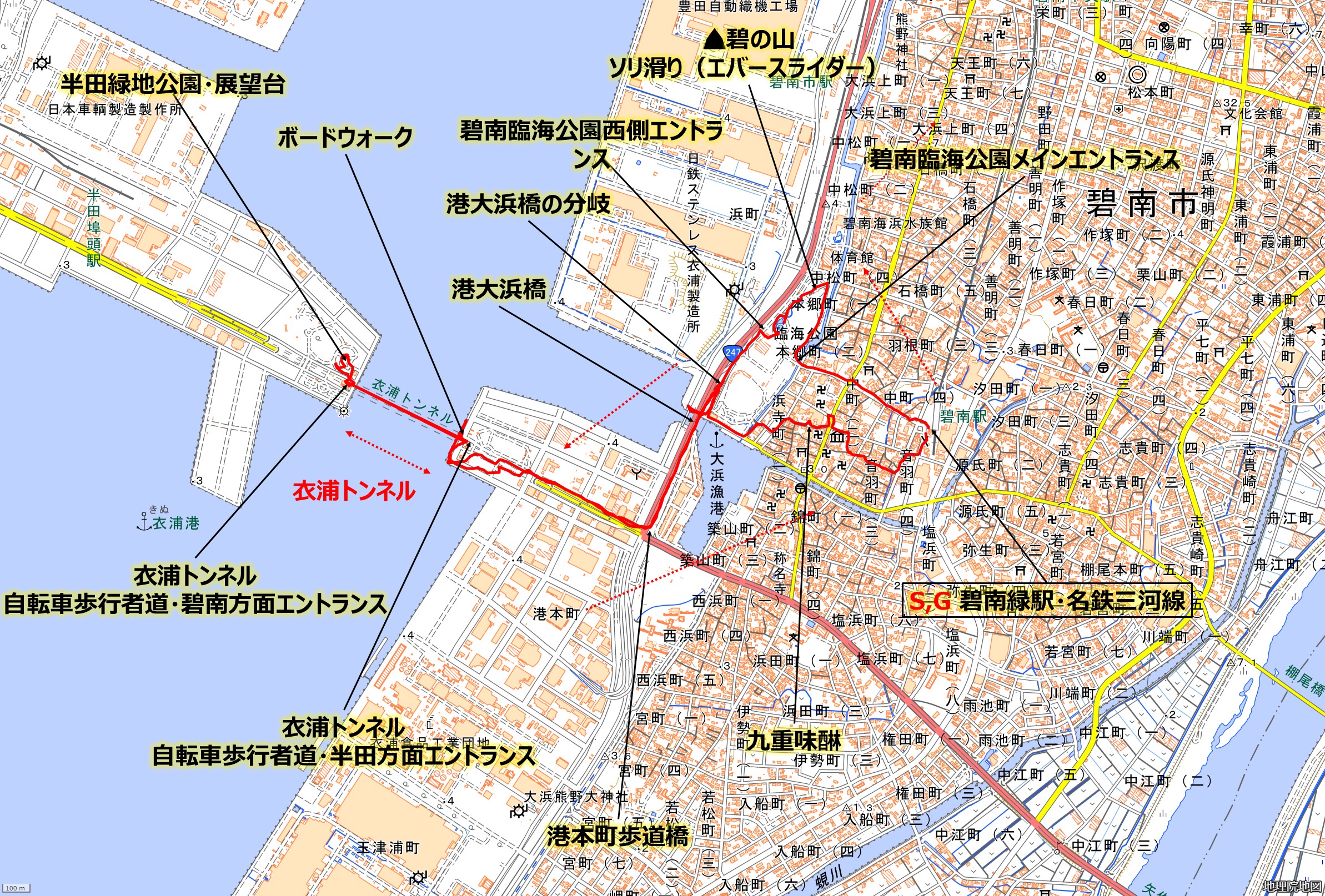 行程 | 【5日】 13:20 碧南駅・名鉄三河線 14:19 港大浜橋の分岐 13:30 碧南市臨海公園メインエントランス 13:37/13:58 碧の山 14:26 港本町歩道橋 14:45 ボードウォーク 14:47 衣浦トンネル・自転車歩行者道・半田方面エントランス 14:58 衣浦トンネル・自転車歩行者道・碧南方面エントランス 15:03/15:23 半田緑地公園・展望台 15:30 衣浦トンネル・自転車歩行者道・碧南方面エントランス 15:40 衣浦トンネル・自転車歩行者道・半田方面エントランス 16:13/16:23 九重味醂 16:35 碧南駅・名鉄三河線 | |