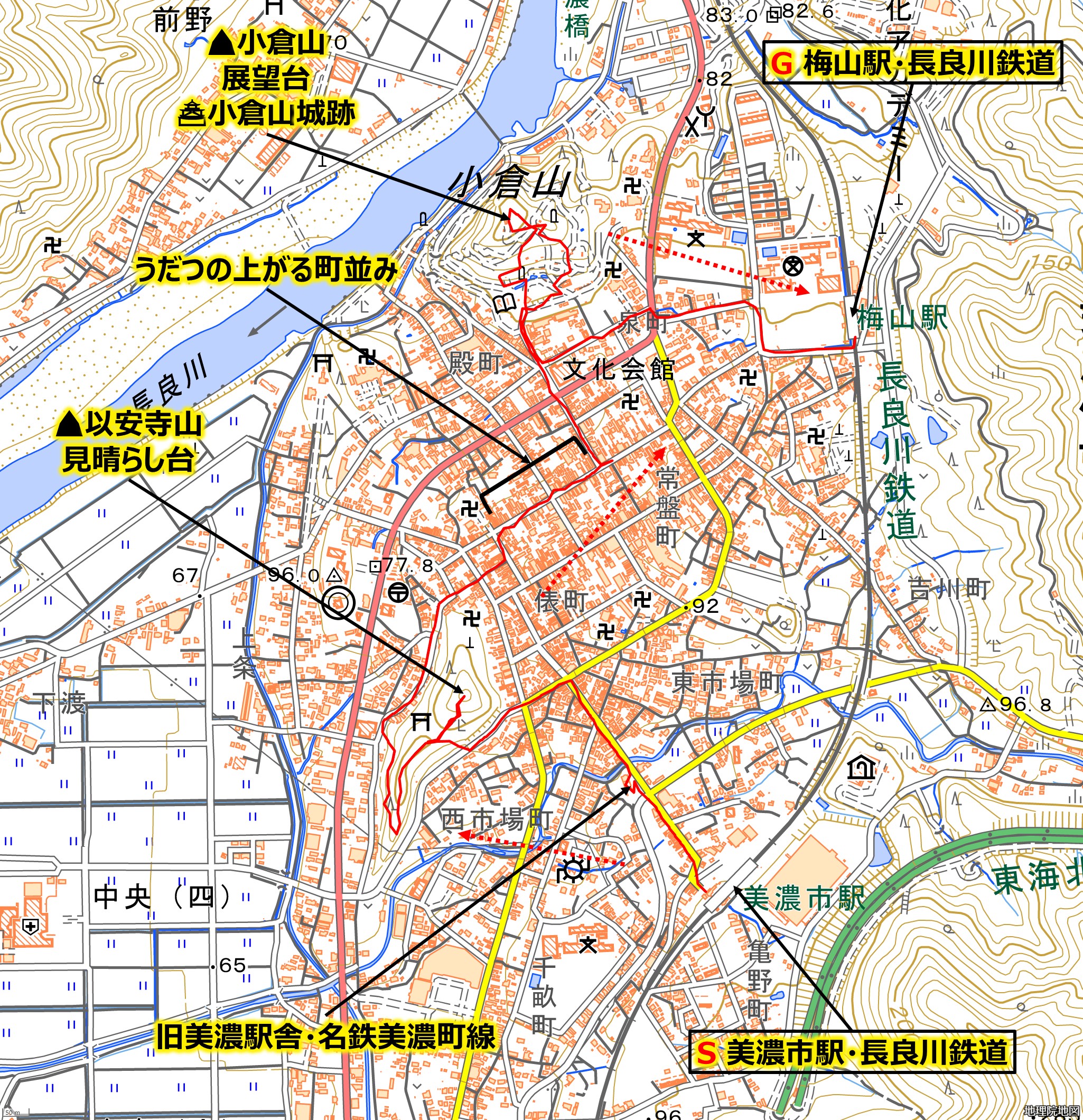 | ポイント | #お楽しみポイント ・以安寺山(いあんじやま、標高120m)、小倉山(おぐらやま、標高315m)の登頂・小倉山城跡 ・うだつが上る町並みの散策 ・旧美濃駅舎・名鉄美濃町線の見学 #基点(駅) ・スタート(S): 美濃市駅・長良川鉄道・ゴール(G): 梅山駅・長良川鉄道 | |