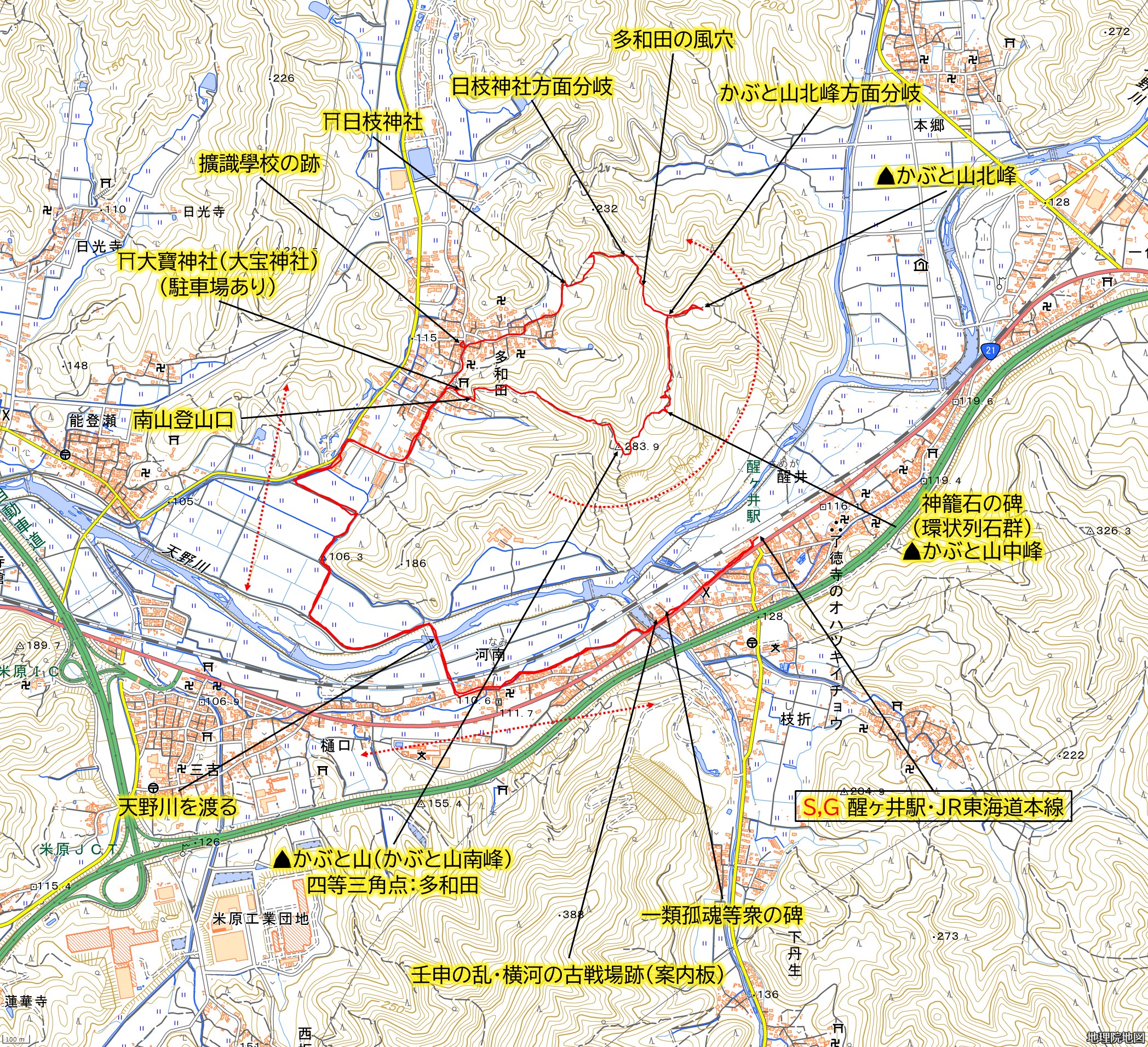 | ポイント | #お楽しみポイント ・かぶと山(兜黛山、かぶと山南峰、八九端山、標高283.9m)、かぶと山北峰(標高315m)の登頂・四等三角点:多和田の確認 ・神籠石(こうごいし)の碑(環状列石群、神籠石様列石) ・多和田の風穴 ・多和田城跡 ・擴識學校(拡識学校)の跡 ・大寶神社(大宝神社) #基点(駅) ・醒ヶ井駅・JR東海道本線 | |